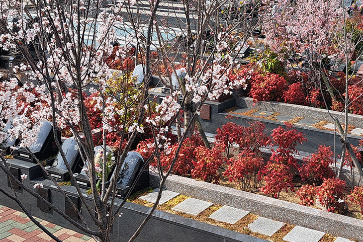 駐車場からの距離が近く、通路も広く参道まで段差がないためお参りのしやすい区画です。手入れの行き届いた緑や花に囲まれてた、明るい空間です。